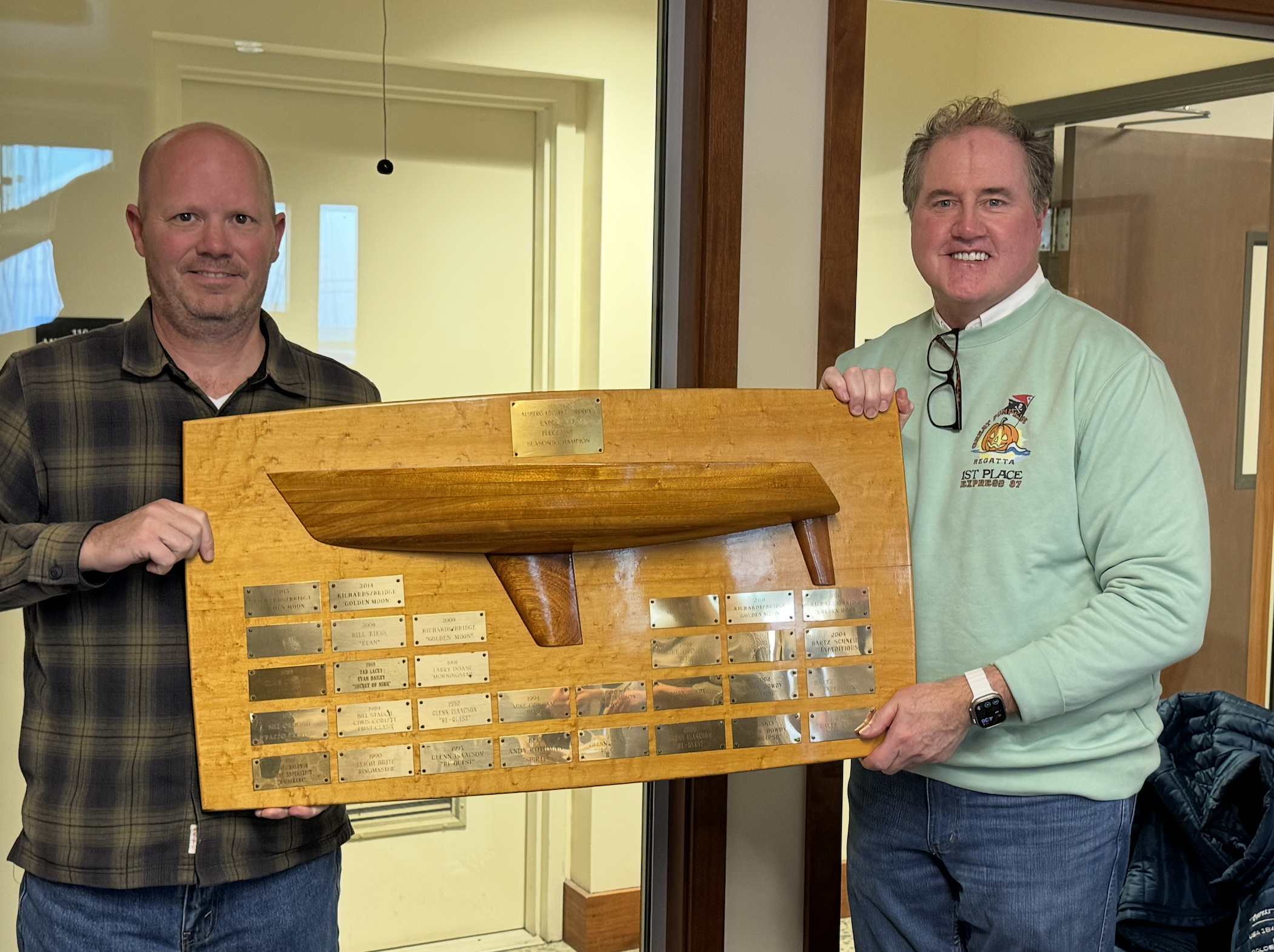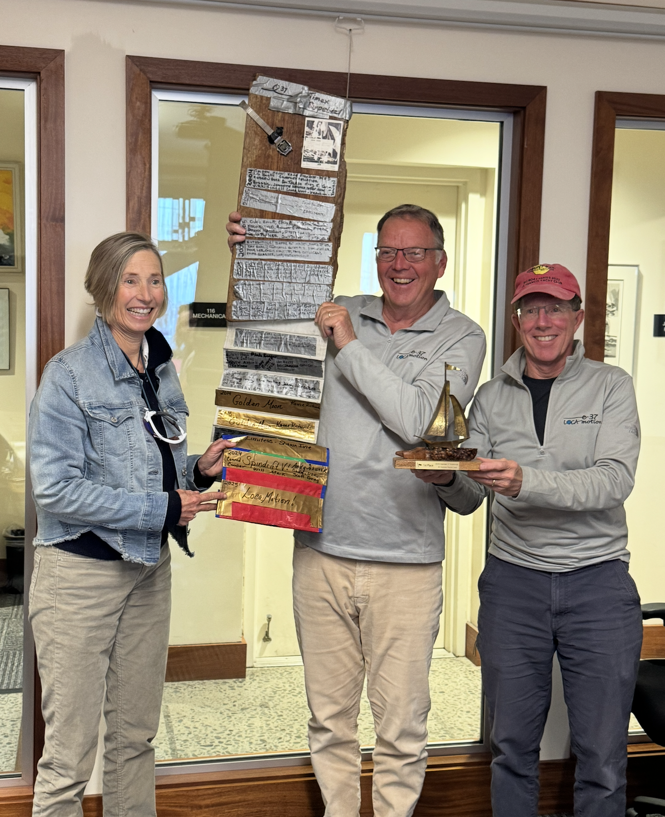 In a heartwarming ceremony, the Express 37 Class Association honored the remarkable achievements of its members for their recent success during the 2024-25 season. Mike Laport and Mike Spitz, the skippers of Golden Moon, brought home the season championship trophy (followed by a long discussion of where to put an additional brass plaque considering that we ran out of room years ago). Heidi Hall and Mark Chaffey, skippers of Loca Motion, brought home the esteemed and treasured Timex Trophy for their victory in the Rolex Big Boat Series. According to a helpful but stilted AI agent, “The event featured two standout moments captured in photographs: proud sailors receiving their well-deserved trophies. These images encapsulate the spirit of camaraderie and competition that defines our community. Each trophy represents not just a victory, but the dedication and passion that our sailors bring to the water. Join us in celebrating these exceptional individuals and their contributions to the sport.”