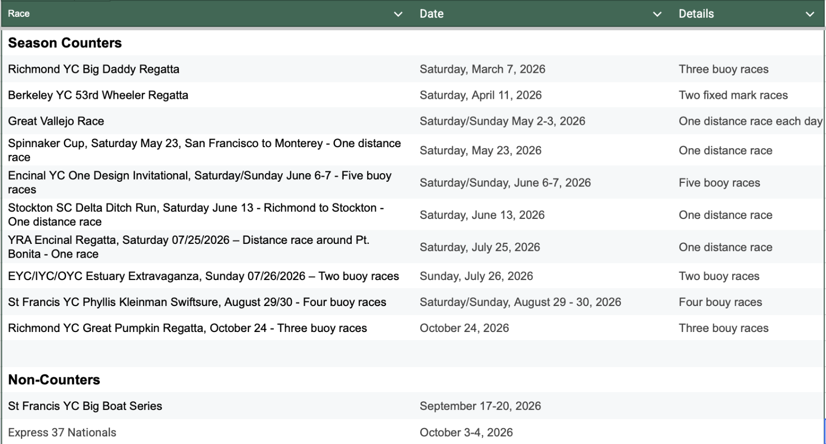 | Boat | Big Daddy 1 | Big Daddy 2 | Big Daddy 3 | Wheeler 1 | Wheeler 2 | Vallejo 1 | Vallejo 2 | YRA S. Bay 1 | YRA S. Bay 2 | YRA 2nd Half Opener | |